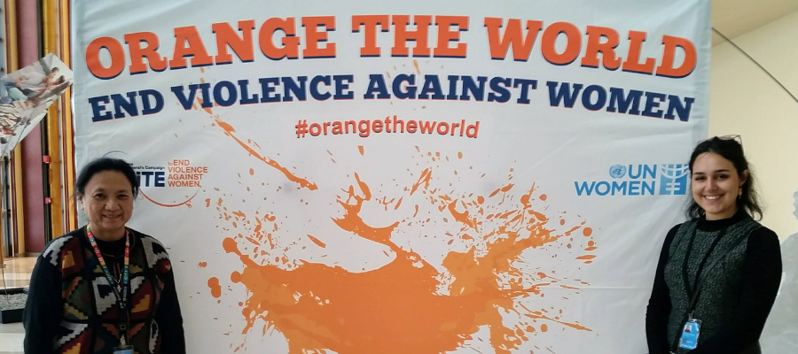 Imagem de destaque: Irmã Janet Palafox ibvm com a ex-estagiária da ONG ONU IBVM Francesca Torcasio Barberis na ONU ‘Orange the World’ evento.